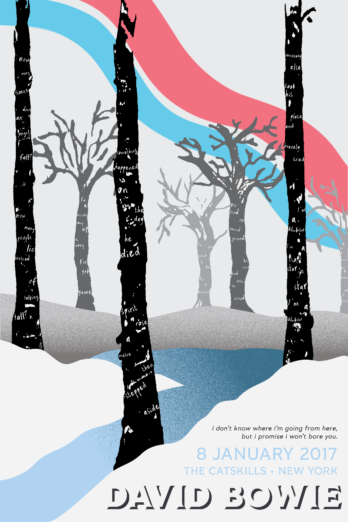 This poster is for a hypothetical event to commemorate what would have been the 70th birthday of musician David Bowie. The event is a listening party in the Catskill Mountains, NY, where under certain birch trees a Bowie song would play. The concept is for the listeners to wander through a forest, from tree to tree listening to Bowie’s music catalog. Song lyrics from “Blackstar”, from his last studio album, mark birch trees.